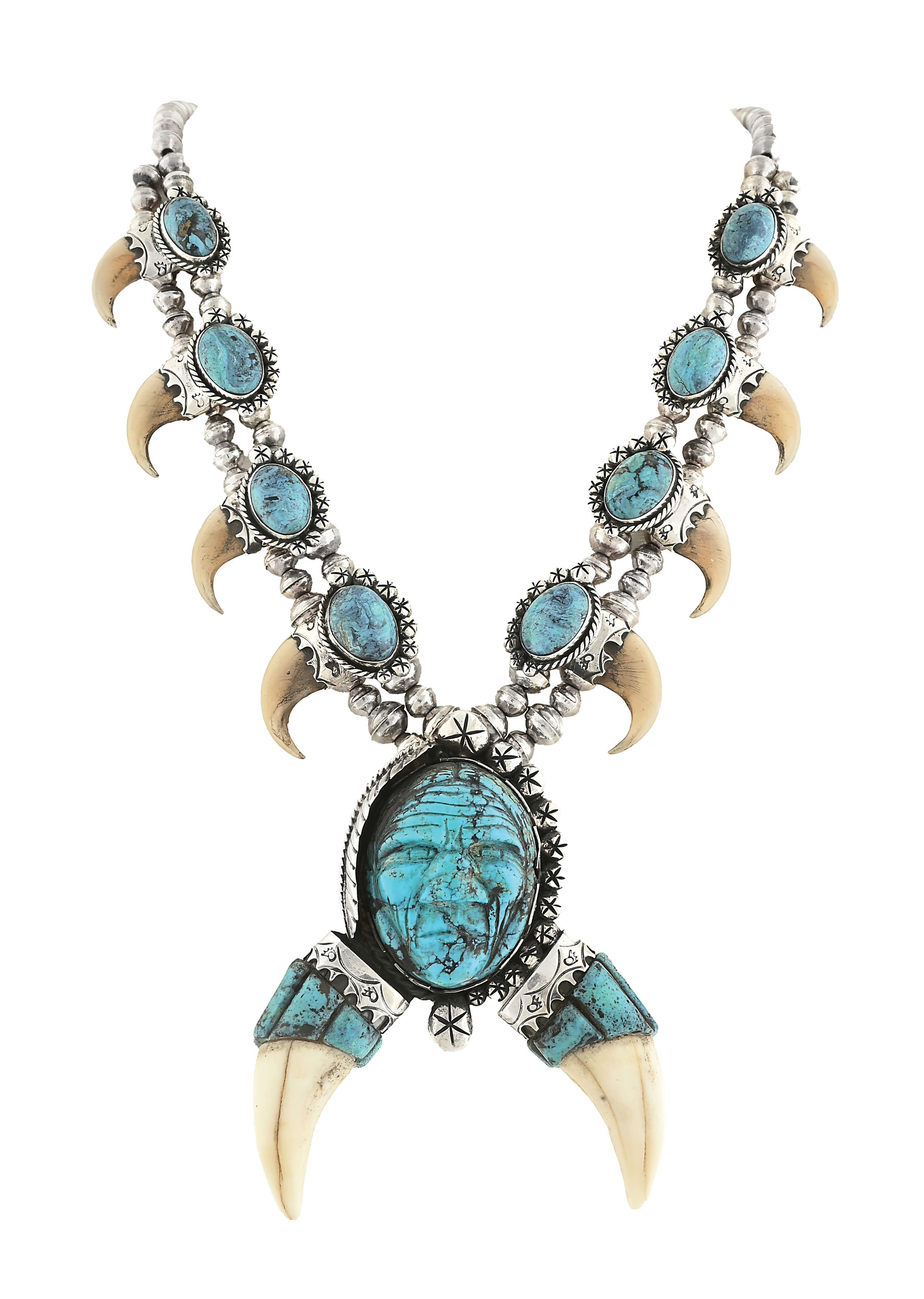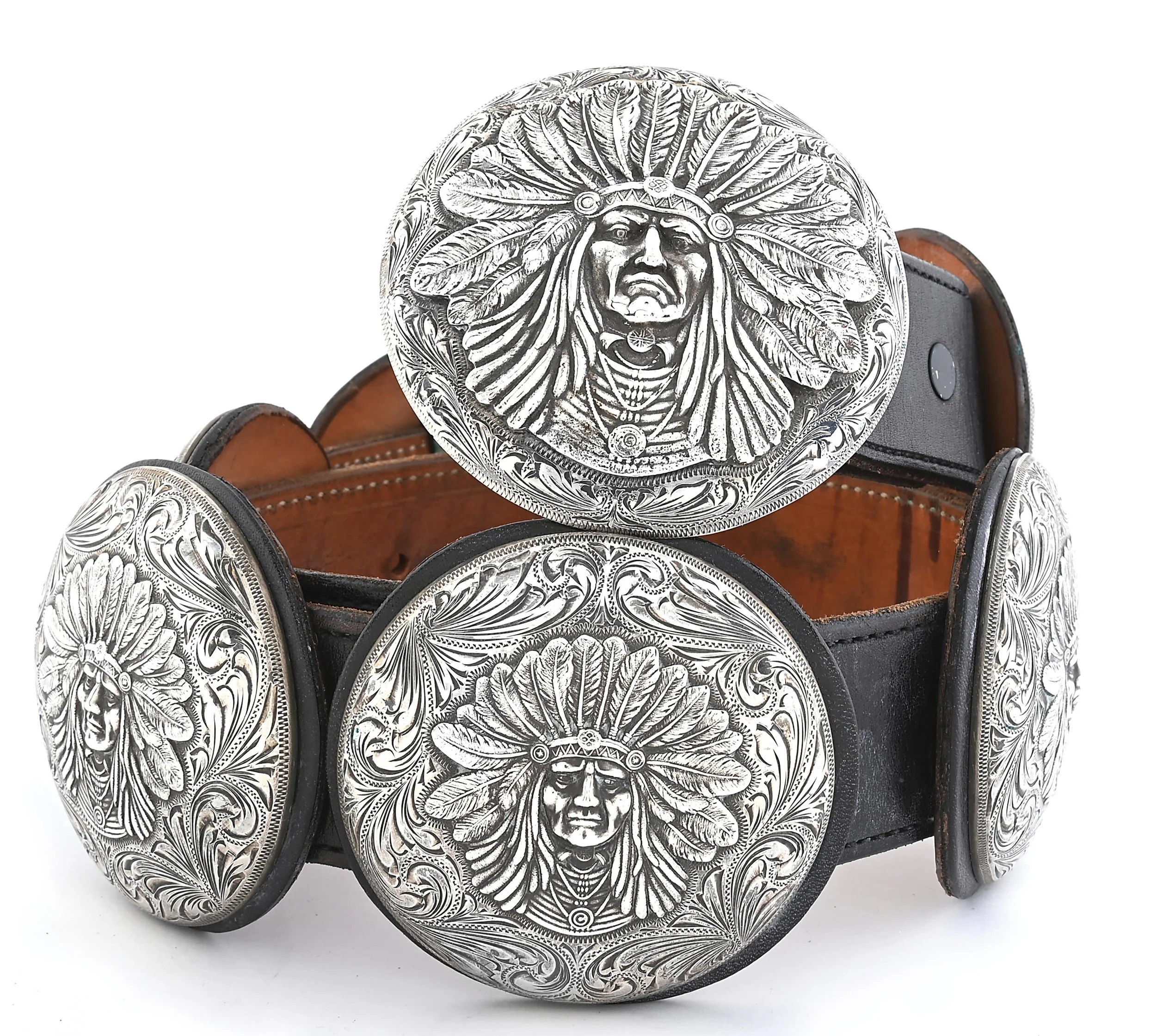 Considered one of the standout pieces in the entire George Pitman collection, this exquisite two-tone brown floral carved Bohlin / Hollywood sterling and gold parade saddle, custom made for Louise Cottam of Santa Barbara, California, in the late 1930s is a slight variation on the Machris model that debuts in the 1937 Bohlin catalog one page following the "Cottam" saddle named for Louise's husband, Russell. According to Bohlin expert and author, James H. Nottage, "Louise and her husband, Russell both had fine Bohlin outfits which they rode in parades, horse shows and rodeos. Hers, in many ways more elegant, won prizes at the Santa Barbara Fiesta Days, the Bakersfield Frontier Days and other gatherings". The saddle features a figure-eight floral pattern and multiple pictorial carvings including a longhorn on the 14" seat and a beautifully detailed let 'er buck cowboy on the fenders which, according to Nottage, is characteristic of the work of Bohlin leather carver extraordinaire, Gabriel Diaz. The saddle itself is artistically adorned with leaf pattern conchos along the full perimeter interspersed with Bohlinmade silver spots. The entire front and cantle are fully silvered with a twisted rope edged gullet, horn cap with gold bucking horse and cantle cover. The leather saddle strings protrude just below an engraved silver and gold horsehead concho. The skirts and fenders are mounted with intricately engraved silver corner plates with gold vignettes featuring a bucking horse, longhorn, and one depicting Louise showing her horse picking up a lead into a canter and featured in a full page photo on pg 126 of Saddlemaker to the Stars. The elegant 22" Tapaderos are mounted with multiple gold horsehead conchos while the Breast Collar continues the overall silver leaf & silver spot theme but adds a bold central medallion with the name "Louise" in raised gold script above a golden show horse. A second Breast Collar is also included and appears to be of slightly later manufacture (1940s) mounted with round Bohlin horsehead conchos and a different style of Bohlin spots plus a centered three-dimensional gold longhorn concho. The fully matching Bridle continues the leaf and gold horsehead theme and is affixed to a matching bit and ferruled romal reins with adjustable slide. Saddle set includes a brown and white wool Corona Pad plus original cinch. Very fine, 100% original condition, circa 1937-1939 PROVENANCE: EX George Pitman Collection, Rancho Santa Fe, CA PICTURED: James H. Nottage, Saddlemaker to the Stars, The Leather and Silver Art of Edward H. Bohlin, Pgs 126-129 Louise Charlotte Rechner (Cottam) was born May 6, 1907 in Germany and emigrated to the United States in 1918 at age 11 marrying John Russell Cottam in Santa Barbara in 1925 when she was only 18. Louise was an equestrian enthusiast from an early age frequently showcasing her prized horses in shows, parades and rodeos around California. The Cottams has 2 daughters eventually moving to Las Vegas in 1950. Louise passed away in Los Angeles in December of 1980 at age 73