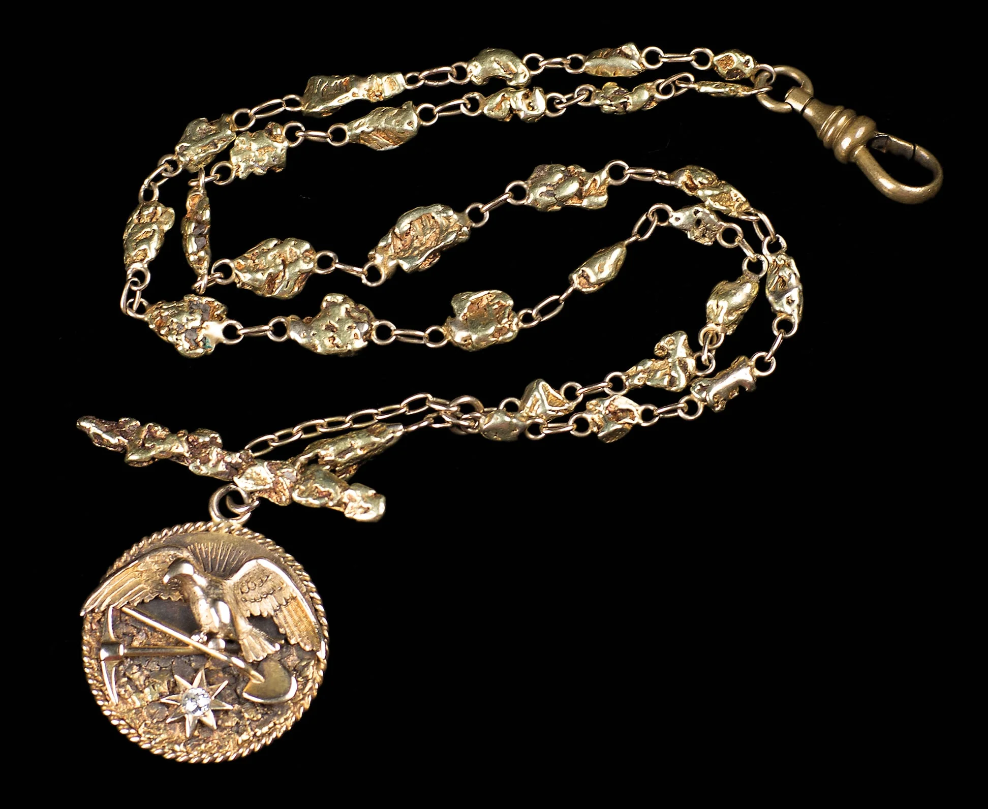 Great old mining fob with a spread-winged eagle perched atop a miner’s crossed pick and shovel, set above a diamond centered star. 1 1/8” diameter. Attached to a 17” nugget chain with a 1 3/4” bar. Medallion is marked “SCHUMAN 18K DAWSON”. 46.5 grams.