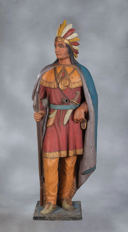 Wm. Demuth & Co. Zinc Cigar Store Figure, "Indian Hunter" model. Rare with rifle, this version of Demuth's Indian Hunter (No. 70 in Demuth's 1875 Catalogue) stands wearing a fringed tunic over fringed leggings, a cape over his shoulders, and a feathered headdress. The figure holds a rifle in his right hand with his knife and pipe at the ready. Old, though not original, paint. The price for such a figure in 1875 is listed in the Catalogue as $80.